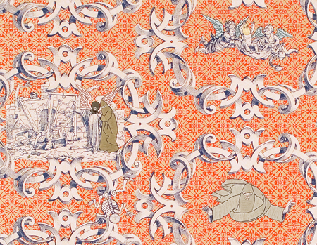 silkscreen, embroidery thread and gold leaf on cotton