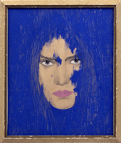 pencil and colored pencil on veneer in artist's frame, metal guard, glass