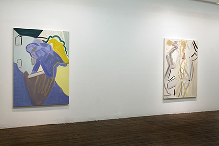 The present group of paintings takes this uncertainty of spatial relationships and its force exerted on the body of the viewer as points of departure. The paintings draw from a concurrent group of works on paper, which originated as bound pages within a book. The book format lent itself to a repetition of “motifs,” and set the conditions for the paintings to develop as variations on a theme. The themes are not ostensibly namable subjects, yet still make use of recurring components and operations. The works on paper are approached as both image and object. A painting may be from a previous drawing—the former taking the latter as a direct referent. Another painting may rather be of a prior drawing—the former depicting the latter as an object in space. Sometimes this shift occurs within the same painting.