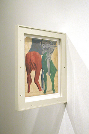 The present group of paintings takes this uncertainty of spatial relationships and its force exerted on the body of the viewer as points of departure. The paintings draw from a concurrent group of works on paper, which originated as bound pages within a book. The book format lent itself to a repetition of “motifs,” and set the conditions for the paintings to develop as variations on a theme. The themes are not ostensibly namable subjects, yet still make use of recurring components and operations. The works on paper are approached as both image and object. A painting may be from a previous drawing—the former taking the latter as a direct referent. Another painting may rather be of a prior drawing—the former depicting the latter as an object in space. Sometimes this shift occurs within the same painting.