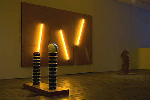 The sculptures in this exhibition are fictional components of the particle accelerator. Fabricated from found objects, arranged and manipulated through the use of copper paint and assemblage the sculptures are akin to props from a Sci-Fi film. The paintings, created using spray paint, acrylic, on canvas and chipboard, and sometimes embellished by light fixtures, draw from notions and representations of the afterlife, subatomic particles and Dark Matter. These works are influenced by modernists such as Helen Frankenthaler, Mark Rothko, Bart van der Leck and Ad Reinhardt and suggest Samson’s wish is to return a stylistic minimalism to its mystical roots.