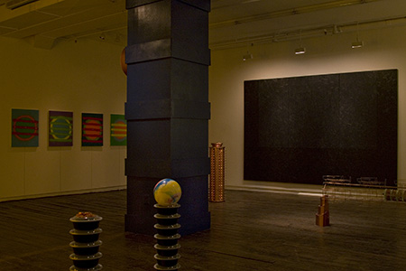 The sculptures in this exhibition are fictional components of the particle accelerator. Fabricated from found objects, arranged and manipulated through the use of copper paint and assemblage the sculptures are akin to props from a Sci-Fi film. The paintings, created using spray paint, acrylic, on canvas and chipboard, and sometimes embellished by light fixtures, draw from notions and representations of the afterlife, subatomic particles and Dark Matter. These works are influenced by modernists such as Helen Frankenthaler, Mark Rothko, Bart van der Leck and Ad Reinhardt and suggest Samson’s wish is to return a stylistic minimalism to its mystical roots.