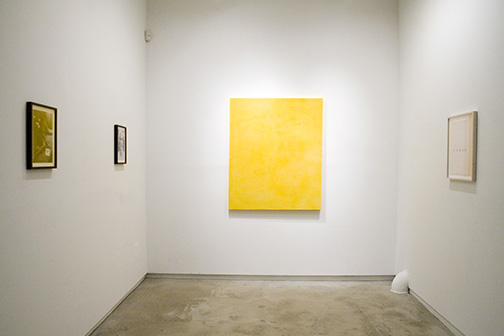 As a result these works are often adorned with records of dates, places and objects. An untitled coin rubbing, suggests a possible routine. Collages consist of the above-mentioned stickers affixed to magazine clippings from popular fashion publications.   “Ruby Red,” a near monochrome of “sunshine yellow,” is painted on the raw canvas from the backside of an abandoned painting. Upon the washy color field are affixed two small labels mimicking the gesture of painting.