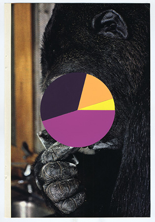 Hug interprets these surveys in three different media. He has translated some of the found data into Color-aid pie charts applied directly over the center of pages from National Geographic magazine. Developed in 1948, Color-aid was initially designed as a backdrop for photographers, it was soon discovered by Josef Albers and has since then been a traditional media for modernist color theory. Hug’s act of superimposing these charts over the often iconic images from National Geographic, underlines our distance from the “natural world” and the ubiquity of data once removed from its original context. His gesture seems to negate the image of “nature” as presented by the “adventure” periodical made for armchair explorers.