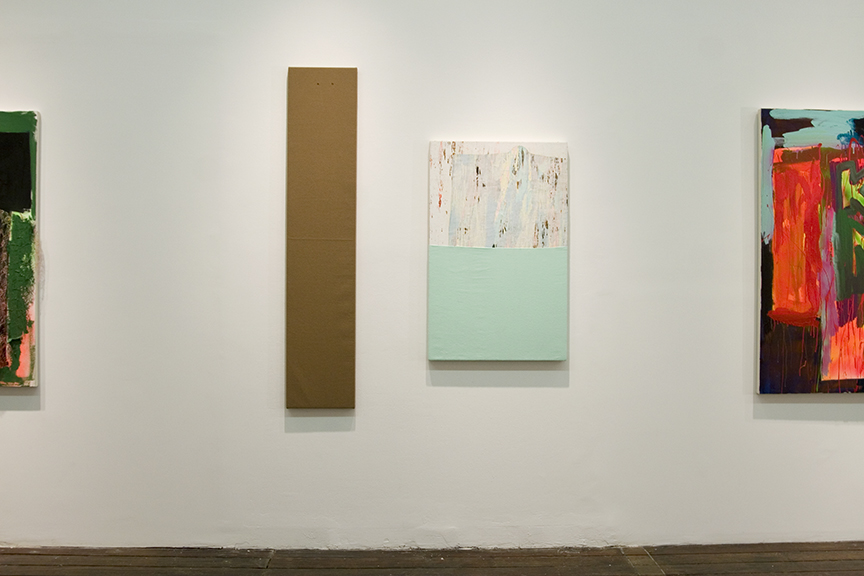 Yoon works quickly and intuitively, relying on a spontaneous relationship to the subject and medium. Her technique is automatic, and immediate and she uses her dripping, peeling, pasting, cutting and spraying to unite these works into a cohesive body. Her colorful paintings are both tactile and energetic and remind us that creation is born of many different kinds of emotional engagement with our own physicality.