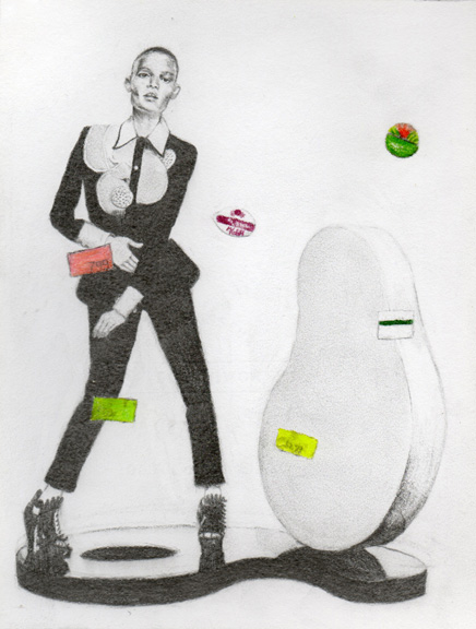 A series of collages such as “Olives, Greek,” “Sweetstar,” and “Christmas,” consist of the above mentioned stickers affixed to magazine clippings from popular fashion publications. Marks are made with the common adhesive labels from groceries and other daily goods, shifting the path of the viewer’s eye though the altered photographic composition or providing a subject for the model’s ambiguous gaze. Continuing to make use of what is ubiquitous and readily available, Tranchell transforms an appropriated photo-based advertisement into a compositional dialogue of various indexes. This act simply but radically alters the way we see, perceive and absorb these stylized images.