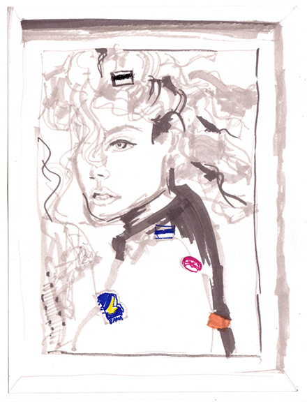 A series of collages such as “Olives, Greek,” “Sweetstar,” and “Christmas,” consist of the above mentioned stickers affixed to magazine clippings from popular fashion publications. Marks are made with the common adhesive labels from groceries and other daily goods, shifting the path of the viewer’s eye though the altered photographic composition or providing a subject for the model’s ambiguous gaze. Continuing to make use of what is ubiquitous and readily available, Tranchell transforms an appropriated photo-based advertisement into a compositional dialogue of various indexes. This act simply but radically alters the way we see, perceive and absorb these stylized images.