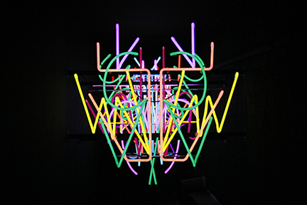 assume vivid astro focus's exhibition use the architecture of the gallery to create a dialogue between three distinct environments featuring an installation of 3-D wallpaper, a dark subterranean corridor of music and flashing neon sculptures, and a cordoned multi-disciplinary room that will feature an ongoing series of music-related performances.