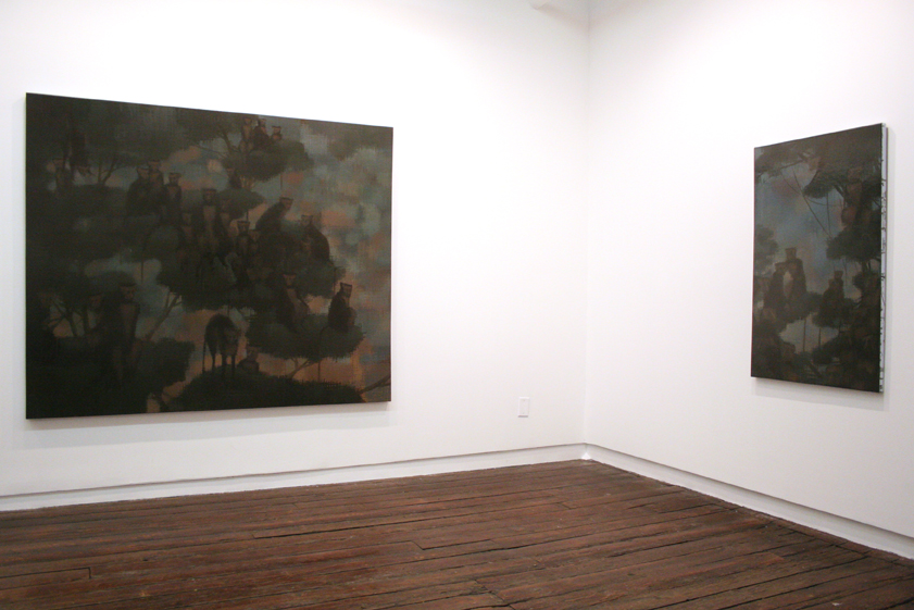 While decrepit cities like Venice and Rome were revived and converted into meccas of tourism by a Victorian appetite for the lost world of the ancients, an entire genre of parlor painting was being created to capture and bring home evidence of the empire's expanded frontiers. A contemporary series of monkey (macaque) paintings by Wetzel find their genesis in a parlor genre of Dutch origin, practiced by Gillis Claesz de Hondecoeter for one, that found its way into the English and French Empires. These works crammed as much exotic flora and fauna as possible into a precursor of the photographic postcard. Here the monkey's look out at us and serve as a sudden and expectant mirror between the civilized and the savage, the origin of Darwinian theory and the attendant religious discomfort of its implications. There is an intricacy in the layered manner that Wetzel molds his forms with pigment and light. The color is almost woven in its application, a reminder of the woven surface of linen and wall hangings, a lesser and more decorative form of parlor art. This challenges the pretensions of ‘painting’ reminding us of the vanity of collectables while simultaneously critiquing the imbedded function of accumulating wealth.