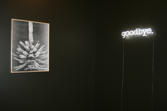 The walls in The Long Goodbye are painted in progressively darkening shades of gray. Inspired by a technique often used in institutional black & white photography exhibitions to accentuate the contrast of the pictures, Freeman/Phelan appropriate this strategy to point toward the use of the architecture of the exhibition space as a theatrical device that assists seemingly autonomous pictorial objects. Each shade of gray is presented/ positioned as a work in itself and titled after the name of the actual 'style' of paint such as "Ice Age", "Silver Queen", "Platinum Plate", "Diamond Heights", "Cast in Stone", "Dark Shadows" and "Carbon Copy". As the viewer passes through the exhibition he reaches a room, painted in the darkest shade of gray that is lit only by a single white neon sign that reads "goodbye". The light from the sign is cast upon the only object in the room, a black & white pigment print of an upside down palm tree - a reference to the City of Los Angeles's recent decision to systematically replace all palm trees in public spaces with ones that are coniferous. Chinatown, a spatialized loop of the sound of running water taken from the introduction of the Can song Sing Swan Song, fills the room and borrows from a recent tradition of marketing sound as a relaxation device. In these products isolated sounds of nature (i.e. water, wind, birds) are used for insomnia and other psychological ailments becoming a bastardized variation of eastern spirituality that idealizes and recontextualises nature to sooth the woes of the modern world. The title is taken from the Roman Polanski detective movie about political corruption surrounding water management and land use in Los Angeles.