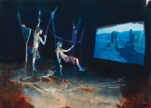 John Connelly Presents is pleased to announce the debut solo exhibition of New York based artists Donnie & Travis. Working in collaboration, Donnie & Travis create photo based figurative works on silk that are embellished with textile dyes and silk & cashmere embroidery. Donnie & Travis's subjects are usually solitary or paired figures situated in pastoral or metaphysical landscapes. They gaze directly at us, hide behind tangled shrouds or interact with ambiguous geometric structures. Using the process of cyanotype, Donnie &Travis embed their subjects in a pictorial reality that begins and ends with a reflection on the body and it's physical indexes. By the time Donnie &Travis's subjects inhabit their framework, they have gone through three generations of mechanical reproduction. Already approaching drawing through this physical degeneration, the figures are then suffused with hand-made elements, washes of textile color and elaborately embroidered details. Embroidery is what holds the image to the canvases, as everything else becomes liquid dyes, skin, blood and vapor. Donnie &Travis’s work investigates a unique territory within their polar processes of the mechanical and the handmade, creating an amalgam of mediums that treads a beautifully distorted line between portraiture and allegory.
