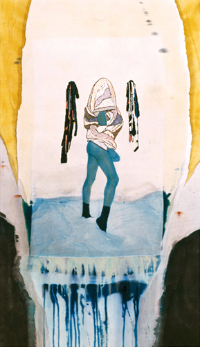 John Connelly Presents is pleased to announce the debut solo exhibition of New York based artists Donnie & Travis. Working in collaboration, Donnie & Travis create photo based figurative works on silk that are embellished with textile dyes and silk & cashmere embroidery. Donnie & Travis's subjects are usually solitary or paired figures situated in pastoral or metaphysical landscapes. They gaze directly at us, hide behind tangled shrouds or interact with ambiguous geometric structures. Using the process of cyanotype, Donnie &Travis embed their subjects in a pictorial reality that begins and ends with a reflection on the body and it's physical indexes. By the time Donnie &Travis's subjects inhabit their framework, they have gone through three generations of mechanical reproduction. Already approaching drawing through this physical degeneration, the figures are then suffused with hand-made elements, washes of textile color and elaborately embroidered details. Embroidery is what holds the image to the canvases, as everything else becomes liquid dyes, skin, blood and vapor. Donnie &Travis’s work investigates a unique territory within their polar processes of the mechanical and the handmade, creating an amalgam of mediums that treads a beautifully distorted line between portraiture and allegory.