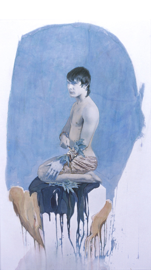 John Connelly Presents is pleased to announce the debut solo exhibition of New York based artists Donnie & Travis. Working in collaboration, Donnie & Travis create photo based figurative works on silk that are embellished with textile dyes and silk & cashmere embroidery. Donnie & Travis's subjects are usually solitary or paired figures situated in pastoral or metaphysical landscapes. They gaze directly at us, hide behind tangled shrouds or interact with ambiguous geometric structures. Using the process of cyanotype, Donnie &Travis embed their subjects in a pictorial reality that begins and ends with a reflection on the body and it's physical indexes. By the time Donnie &Travis's subjects inhabit their framework, they have gone through three generations of mechanical reproduction. Already approaching drawing through this physical degeneration, the figures are then suffused with hand-made elements, washes of textile color and elaborately embroidered details. Embroidery is what holds the image to the canvases, as everything else becomes liquid dyes, skin, blood and vapor. Donnie &Travis’s work investigates a unique territory within their polar processes of the mechanical and the handmade, creating an amalgam of mediums that treads a beautifully distorted line between portraiture and allegory.