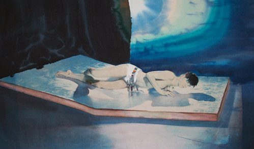 John Connelly Presents is pleased to announce the debut solo exhibition of New York based artists Donnie & Travis. Working in collaboration, Donnie & Travis create photo based figurative works on silk that are embellished with textile dyes and silk & cashmere embroidery. Donnie & Travis's subjects are usually solitary or paired figures situated in pastoral or metaphysical landscapes. They gaze directly at us, hide behind tangled shrouds or interact with ambiguous geometric structures. Using the process of cyanotype, Donnie &Travis embed their subjects in a pictorial reality that begins and ends with a reflection on the body and it's physical indexes. By the time Donnie &Travis's subjects inhabit their framework, they have gone through three generations of mechanical reproduction. Already approaching drawing through this physical degeneration, the figures are then suffused with hand-made elements, washes of textile color and elaborately embroidered details. Embroidery is what holds the image to the canvases, as everything else becomes liquid dyes, skin, blood and vapor. Donnie &Travis’s work investigates a unique territory within their polar processes of the mechanical and the handmade, creating an amalgam of mediums that treads a beautifully distorted line between portraiture and allegory.