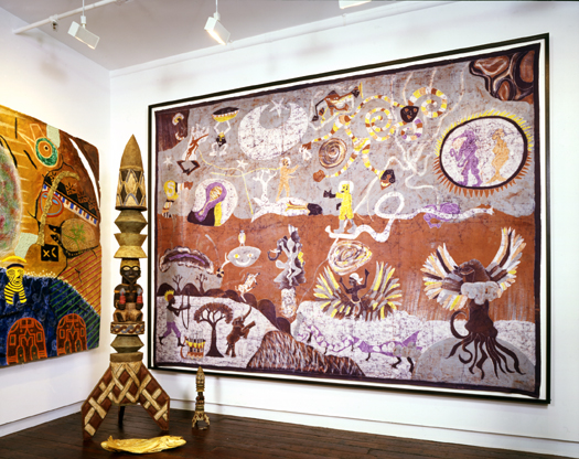 The results are presented in a salon fashion that integrates a new series of paintings made by Boggio Sella in New York with sculpture, batiks and bogolans (mudcloth), created by local artisans in Africa. These custom made fabric pieces and sculptures are hybrids that retain the shapes and style of traditional “African” art while depicting new iconographies inspired by Boggio Sella’s introduction of ideas and fantasies of moon landings and space exploration. The moon is, of course, the second biggest and most visible object in the sky (next to the sun) and has therefore become a universal symbol to all religions and cultures fraught with provincial, religious, nationalistic and personal associations. Boggio Sella carefully funnels the emotions and poetics of this powerful symbol into a series of works that suggest a universal need for inspiration, exploration and (re)discovery.