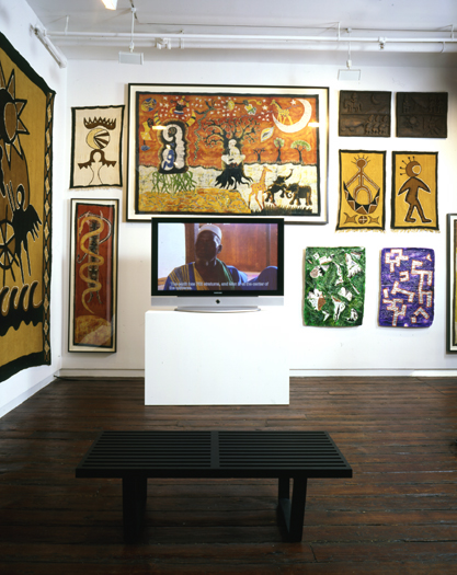 The results are presented in a salon fashion that integrates a new series of paintings made by Boggio Sella in New York with sculpture, batiks and bogolans (mudcloth), created by local artisans in Africa. These custom made fabric pieces and sculptures are hybrids that retain the shapes and style of traditional “African” art while depicting new iconographies inspired by Boggio Sella’s introduction of ideas and fantasies of moon landings and space exploration. The moon is, of course, the second biggest and most visible object in the sky (next to the sun) and has therefore become a universal symbol to all religions and cultures fraught with provincial, religious, nationalistic and personal associations. Boggio Sella carefully funnels the emotions and poetics of this powerful symbol into a series of works that suggest a universal need for inspiration, exploration and (re)discovery.