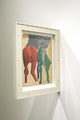 The paintings have at once a centrifugal and centripetal existence: several overemphasize and restate the certainty of their external delimitations, while conversely alluding to their possible status as a detail, an excerpt. The repetition and shifting of motifs across multiple paintings construct modes of framing, and place an image “into infinity.” Each painting reconstitutes a fragment, by focusing in on a piece and organizing a new whole, but one that is noted for its dissimilarity and non-mimetic character. The operation of abstraction is here tied to a process of un-naming. The paintings seek to find an image of a sensation that is experienced before its cause can be determined, before a name seals its identity.