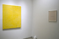 As a result these works are often adorned with records of dates, places and objects. An untitled coin rubbing, suggests a possible routine. Collages consist of the above-mentioned stickers affixed to magazine clippings from popular fashion publications.   “Ruby Red,” a near monochrome of “sunshine yellow,” is painted on the raw canvas from the backside of an abandoned painting. Upon the washy color field are affixed two small labels mimicking the gesture of painting.
