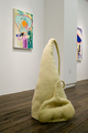 In some works a pair of eyes or hint of limb ominously or playfully suggests the figure. In others the form is fully realized and enacts a comical or horrific snippet of narrative. The sometimes pained, ecstatic icons that reoccur in these works can at times appear architectural, monolithic or amorphous. Fabric is sometimes incorporated into the compositions and in concert with the artist's expressionist use of paint suggests varying states of metamorphosis, growth and decay.