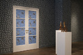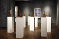 Additional objects in the exhibition include a pair of french doors as well as a window; each set against printed textiles that depict figures free-falling against floating ominous clouds. These figures, silkscreened onto fabric, are derived from archival historical sources as per the artist's continuing practice. The ungrounded figures, work in tandem with the uprooted porcelain trees and endless rain to reinforce a symbolic sense of "falling" of all the various biblical, political, cultural, economic and personal scenarios imaginable.