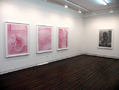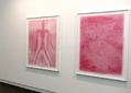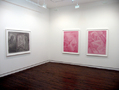 Davis' interest in the impressionable realities of life’s polarities such as sex and death and mass culture’s co-dependent enabling strategies is also reflected in the diptych "ET and Grandma" and the work "The Rumor". Rendered in crimson colored pencil "ET and Grandma" shows the artist's grandmother in a hospital room on her death-bed, her abject stillness as she lies curled in a fetal position is counter balanced by the animated alien in the work's companion piece where ET levitates a diverse group of objects for a rapt audience of youngsters. The light entertainment and diversion that the fictitious movie character offers contrasts with the real pain and struggle experienced by the artist's dying relative and suggests a leveling of the disconnection one is expected to experience between reality and fiction. In "The Rumor", we see the belly, groin and thighs of a robed man as he prepares to insert his semi-flaccid penis into the aluminum hose of an old Electrolux. In these works, death, sex and entertainment become a confused amalgam of both pageantry and tragedy where everyday reality is fused with both the fantastic and the pathetically mundane.